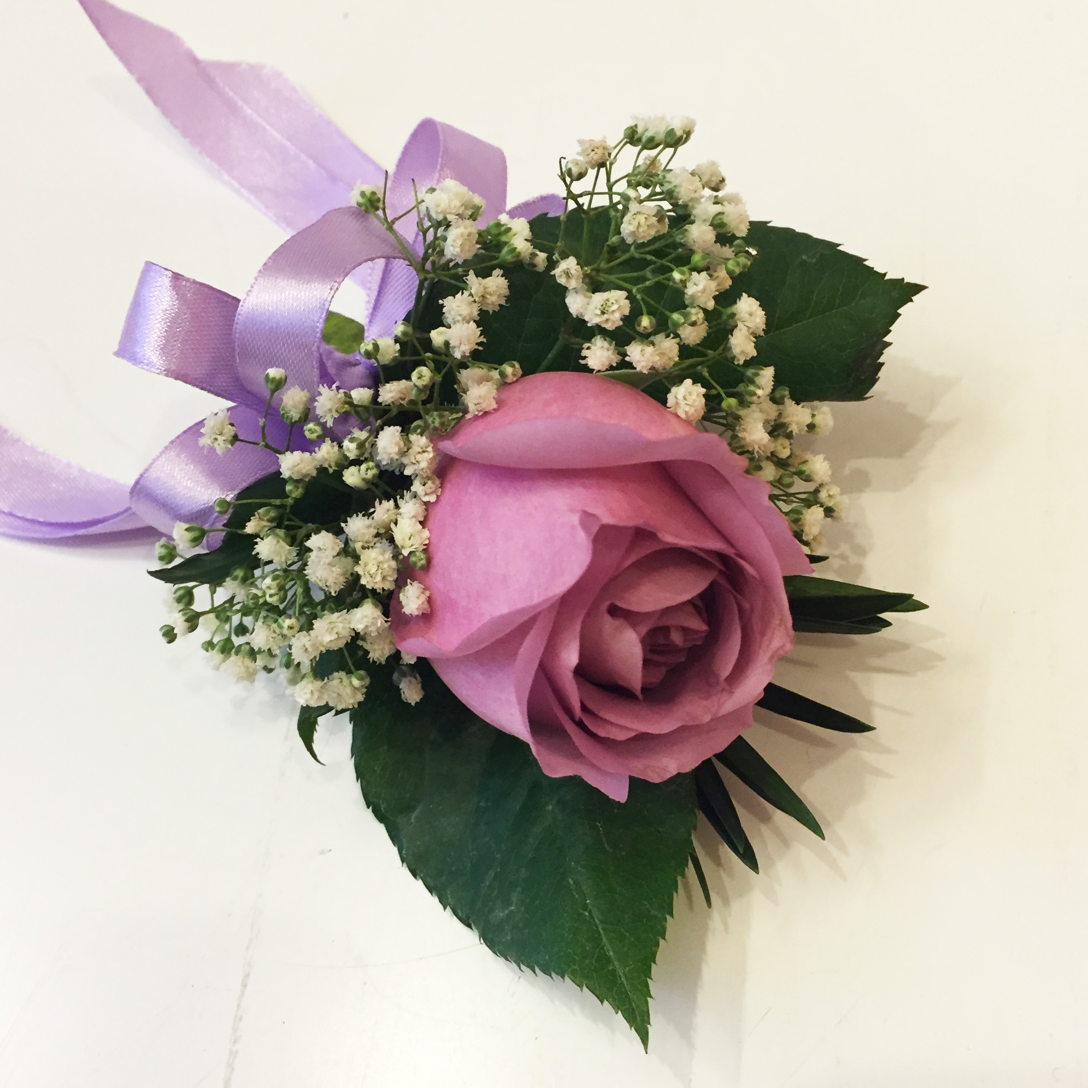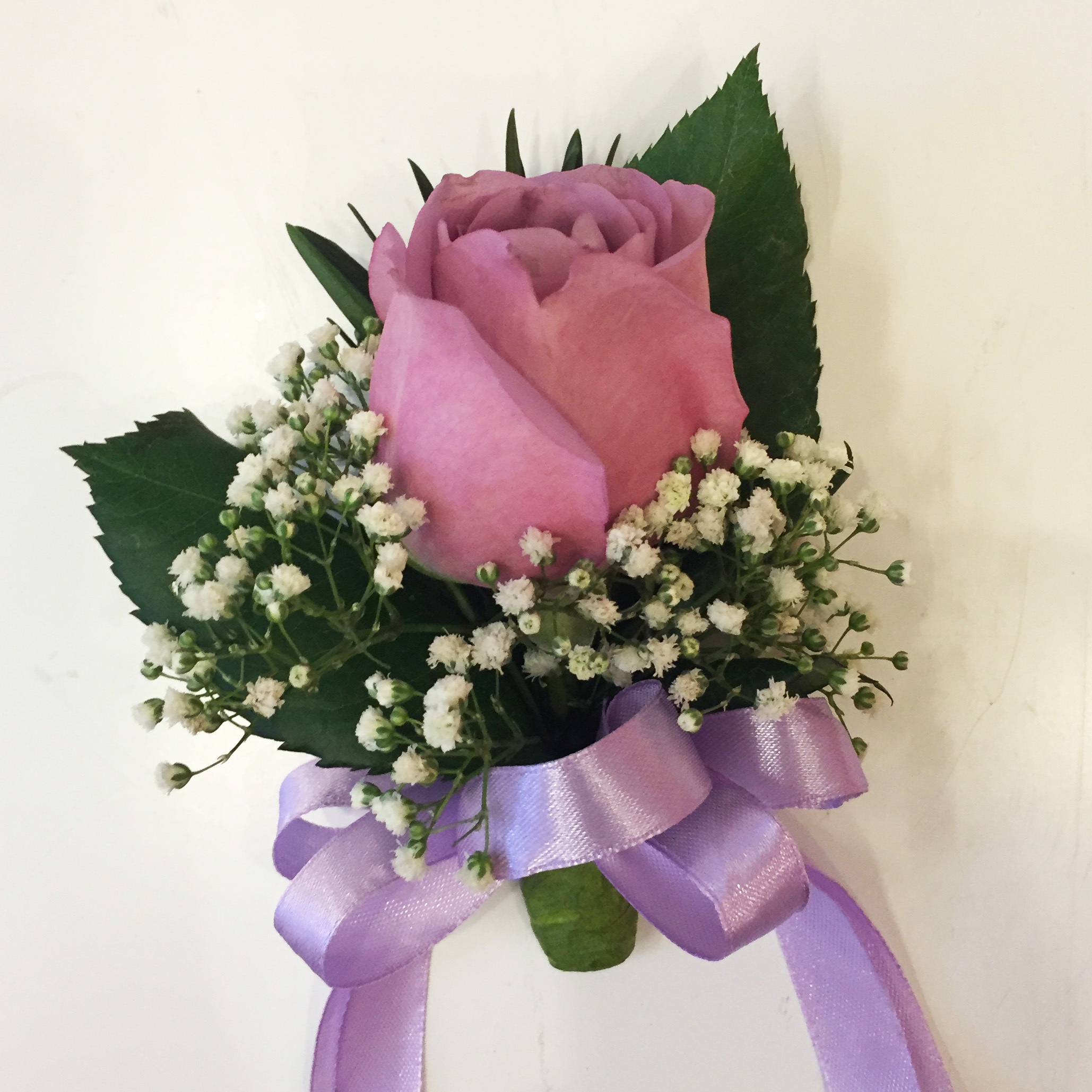 1 Purple Rose with Baby’s Breath Pin Corsage.